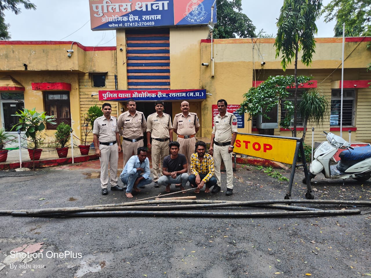 दिनांक 02.08.2023 को फरियादी रमीज़ खान पिता अब्दुल रशिद खान उम्र 37 साल निवासी- 55 मराठो का वास रतलाम ने थाना उपस्थित होकर रिपोर्ट किया कि मै 55 मराठो का वास रहता हूँ। बीएसएनएल रतलाम की मेन्टेन्स का कार्य करिश्मा सिक्यूरिटी सर्विसेस के पास है मै इसी कंपनी मे सुपरवाईजर के पद पर कार्यरत हूँ तथा रतलाम शहर मे बीएसएनएल की केबल का मैन्टेनेन्स का कार्य देखता हूँ। आज सेवेरे 09.00 बजे करीब मै केबल मेन्टेनेन्स का कार्य देखते हुए सैलाना ब्रीज पर पहुचा, तो देखा की 800 पेयर की कापर केबल कटी हुई थी और करीब 60 फीट केबल नही थी जिसकी कीमत 60,000 रूपये करीब है पूर्व मे भी इसी जगह से केबल चोरी हुई थी। जो कोई अज्ञात व्यक्ति रात्री मे चुराकर ले गया था। फिर मैने इस संबंध मे बीएसएनएल कंपनी के एसडीओ जोहेर कालाभाई, चेतन पांचला बीएसएनएल टेलिकोम टेक्निशियन को फोन पर सूचना देकर बुलाया जिन्हे साथ लेकर थाने रिपोर्ट करने आया हूँ। फरियादी की रिपोर्ट पर से अपराध क्रमांक 505/2023 धारा 379 भादवि का पंजीबद्ध कर विवेचना मे लिया गया।