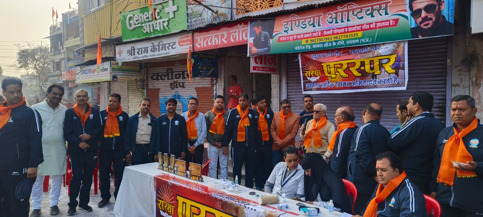 अतिथियों का स्वागत संरक्षक अभय सुराणा, प्रोजेक्ट अध्यक्ष महेश व्यास, दिनेश शर्मा, निमिष व्यास, सचिव अभय लोढ़ा, प्रदीप लोढ़ा, रमेश पोरवाल, नितेश अग्रवाल, मिलन, राकेश, शैलेंद्र व्यास, एमके जैन, जगदीश सोनी, मनीष शर्मा, मनीष जोशी, मनीष बोहरा, निलेश पोरवाल, अभिसार हाडा, दशरथ पोरवाल आदि उपस्थित थे । कार्यक्रम का संचालन दिनेश शर्मा तथा आभार अभय लोढ़ा ने व्यक्त किया । शिविर में लगभग 300 लोगों की शुगर जांच की गई । इस अवसर पर संस्था पदाधिकारी द्वारा डॉ. के. सी. पाठक और सुरेश जी अग्रवाल का स्मृति चिन्ह एवं शाल श्रीफल देकर सम्मान किया गया ।