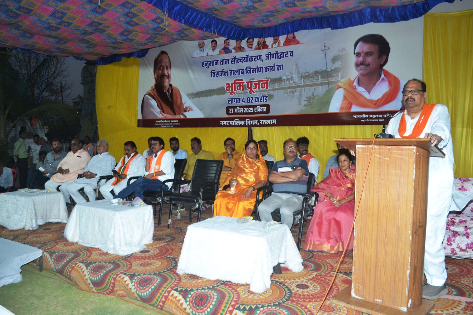 उक्त बात केबिनेट मंत्री माननीय श्री चेतन्य जी काश्यप ने हनुमान ताल के सौन्दर्यीकरण तथा जीर्णोद्धार तथा बजंली बायपास स्थित विसर्जन तालाब के निर्माण कार्य के भूमि पूजन के अवसर पर मुख्य अतिथि के रूप में व्यक्त किये। उन्होने कहा कि हमने रतलाम के बदलाव की दिशा पकड़ी है, रतलाम में नगर की तर्ज पर नहीं महानगर की तर्ज पर मास्टर प्लान बनाना होगा ओर रतलाम के विकास के लिये नगर के प्रत्येक नागरिक को आगे आना होगा।
