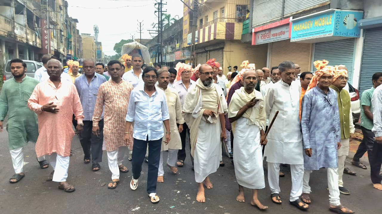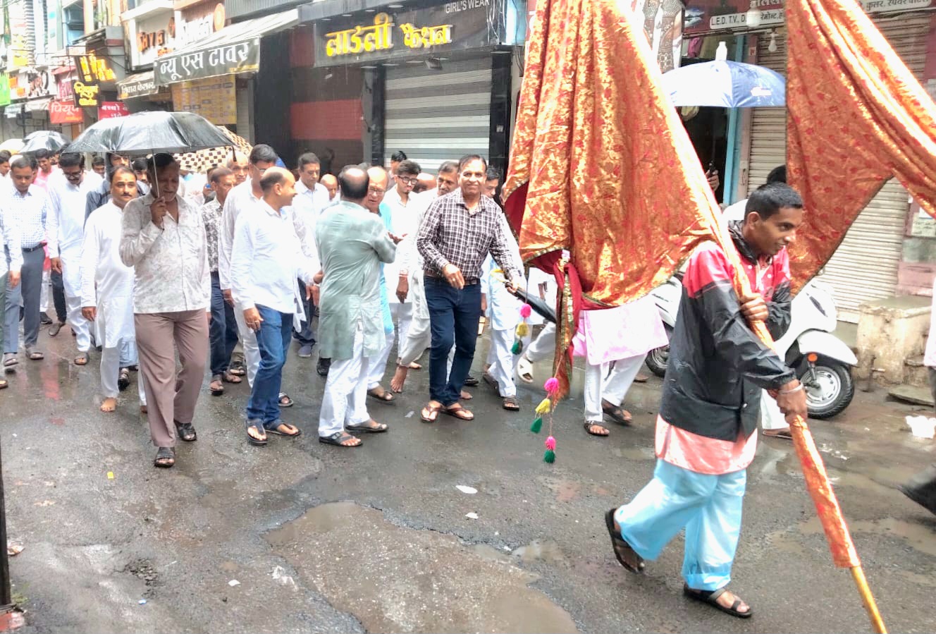 मौसम की प्रतिकूलता के बावजूद सैकड़ो की संख्या में सुश्रावक एवं सुश्राविकाएं मोहन टॉकीज पहुंचे एवं वहां नवकारसी का लाभ लेकर प्रवेश यात्रा प्रारंभ करी। वरघोड़ा में सबसे आगे इंद्रध्वजा उसके पीछे सुसज्जित अश्व पर नवयुवक धर्म पताका लिए चल रहे थे।