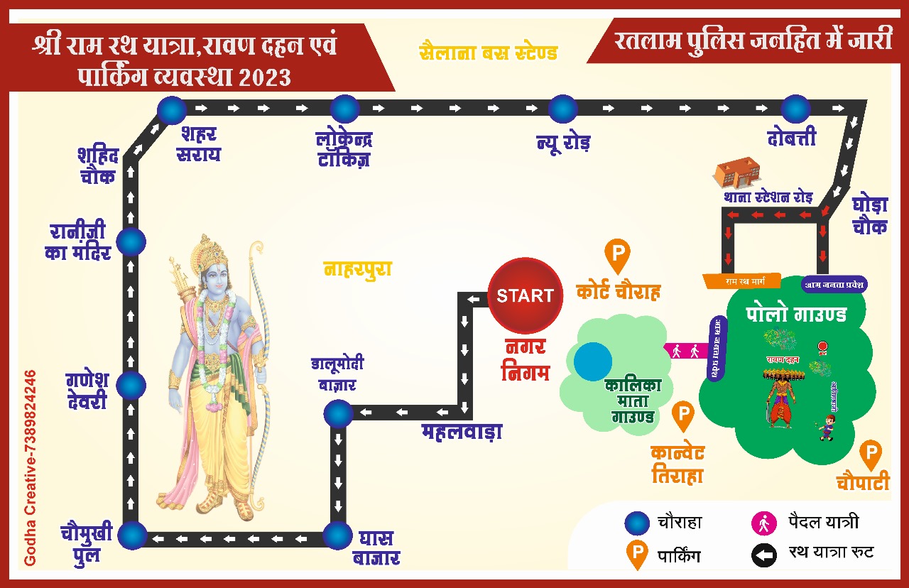 दिनांक 24.10.2023 को विजयदशमी पर्व पर दोपहर 4 बजे से रतलाम शहर मे श्री राममंदिर एवं नगर निगम से 2 रामरथ यात्राए निकली जावेगी एवं रावण दहन किया जावेगा, जिनमे काफी संख्या में आमजन भाग लेंगे। उक्त रामरथ यात्रा के दौरान आम जनता की सुविधा को देखते हुए रतलाम यातायात पुलिस द्वारा निम्नानुसार यातायात व्यवस्था एवं डायवर्जन प्लॉन तैयार किया गया है।