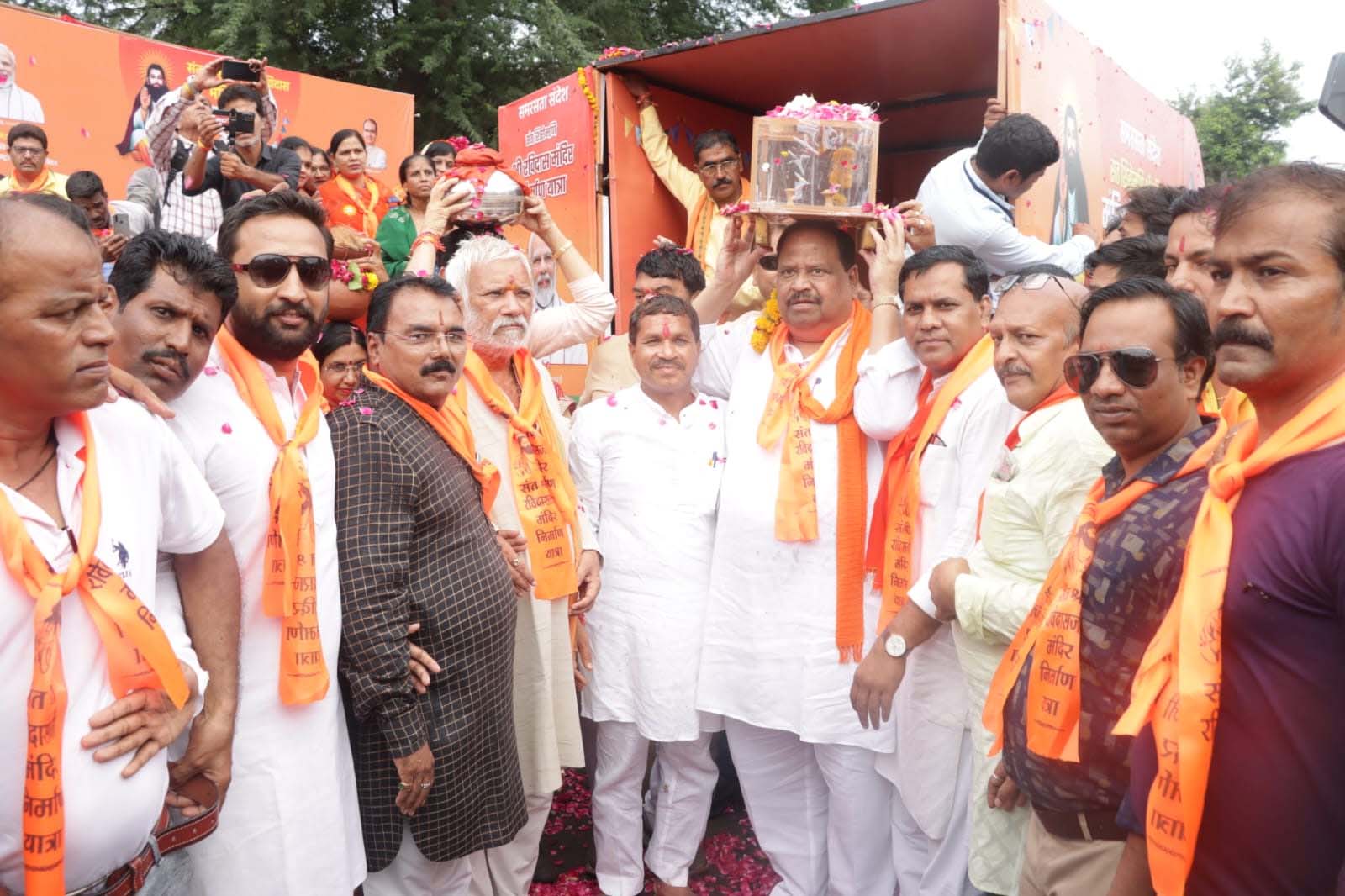 संत शिरोमणि श्री रविदास जी महाराज के सागर में बनने वाले मंदिर के निर्माण हेतु आयोजित समरसता यात्रा का शनिवार शाम रतलाम में आगमन हुआ। इसकी सैलाना रोड स्थित अलकापुरी चौराहे पर भारतीय जनता पार्टी ने भव्य अगवानी की। यात्रा में शामिल प्रतीक को भाजपा जिला प्रभारी प्रदीप पांडे्य, जिलाध्यक्ष राजेंद्र सिंह लुनेरा, विधायक चेतन्य काश्यप, ग्रामीण विधायक दिलीप मकवाना, महापौर प्रहलाद पटेल, निगम अध्यक्ष मनीषा शर्मा, जिला महामंत्री प्रदीप उपाध्याय, निर्मल कटारिया, यात्रा के जिला प्रभारी बलवंत भाटी, सह प्रभारी ओमप्रकाश बोरिया, विधानसभा संयोजक मनोहर पोरवाल, सह संयोजक प्रेम उपाध्याय सहित पार्टी के विभिन्न पदाधिकारियों एवं कार्यकर्ताओं ने भव्य अगवानी की।