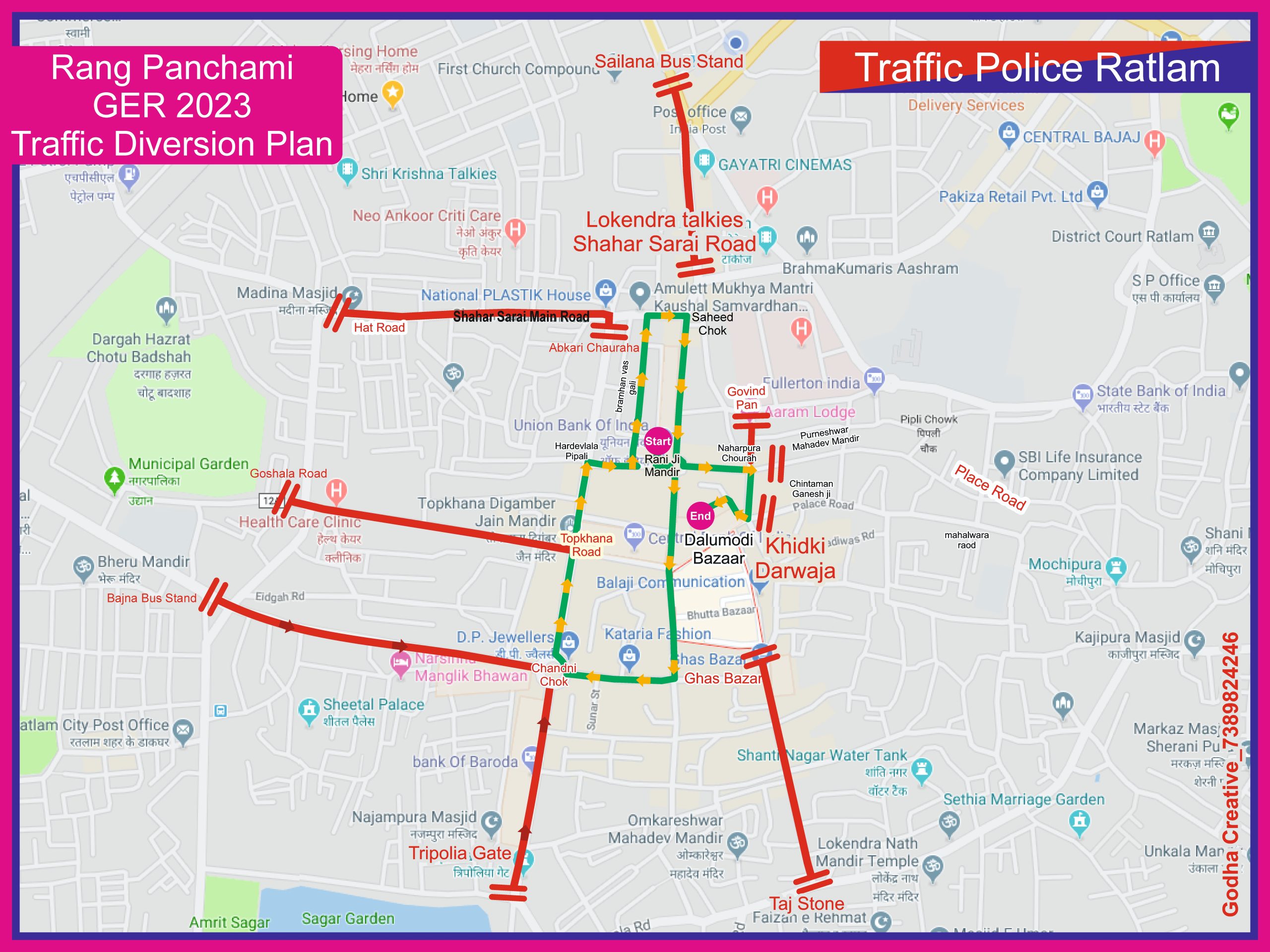 गैर रंग पंचमी जूलुस के दौरान आम जनता की सुविधा को देखते हुए रतलाम यातायात पुलिस द्वारा निम्नानुसार यातायात व्यवस्था एवं डायवर्सन प्लॉन तैयार किया गया है:-