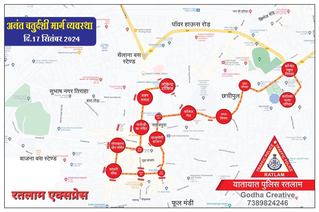 अनंत चतुरदर्शी/गणेश प्रतिमा विसर्जन एवं झाँकीया के दौरान उपरोक्त यातायात मार्ग परिवर्तन लागू रहेगा शहर की आम जनता से यातायात पुलिस की अपील है कि मार्ग परिवर्तन के दौरान सहयोग प्रदान कर असुविधा से बचे।