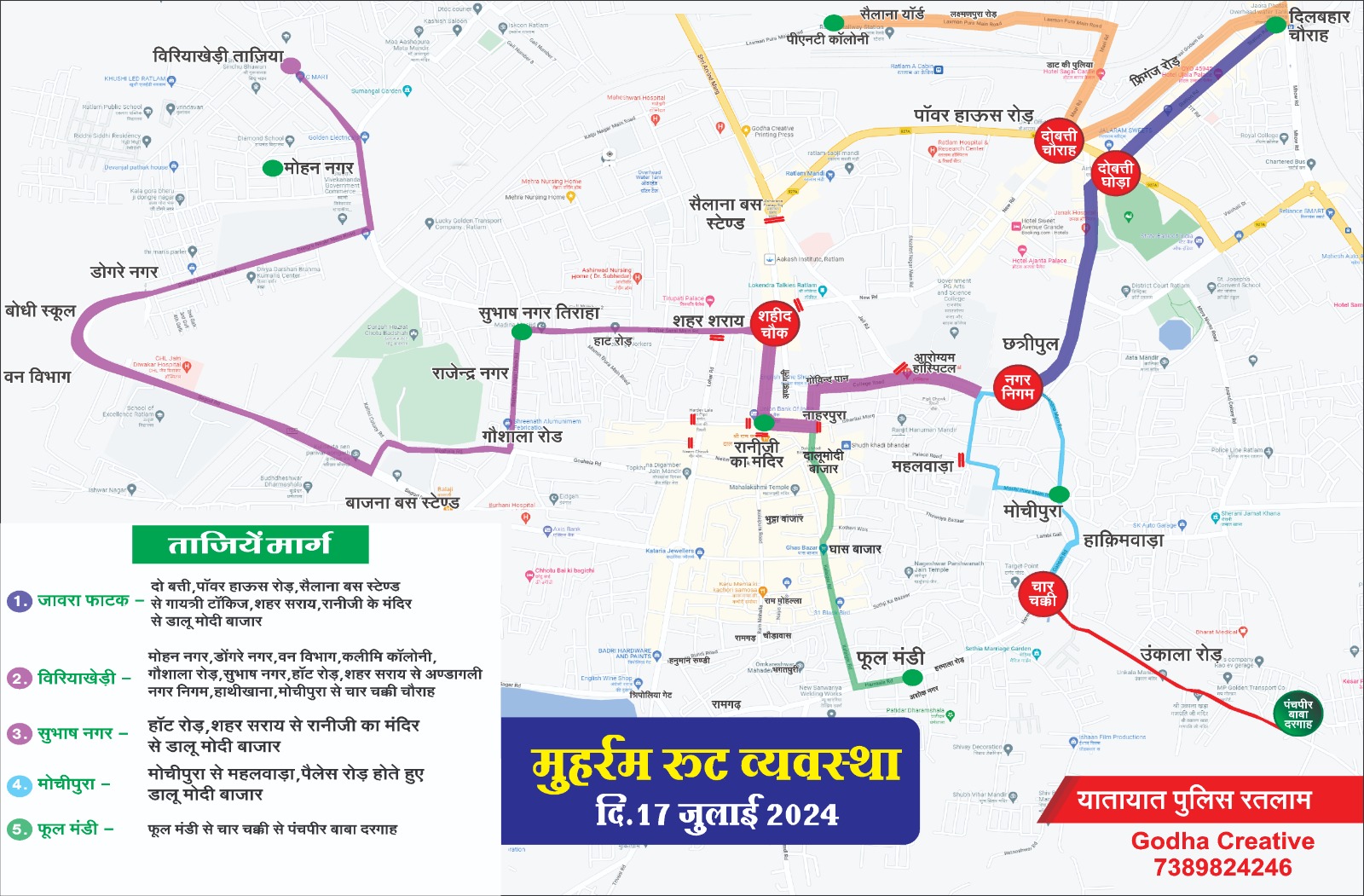मोहर्रम पर ताजिये एवं अखाडे निकलने के दौरान उपरोक्त यातायात मार्ग परिवर्तन लागू रहेगा शहर की आम जनता से यातायात पुलिस की अपील है कि मार्ग परिवर्तन के दौरान सहयोग प्रदान कर, असुविधा से बचे।