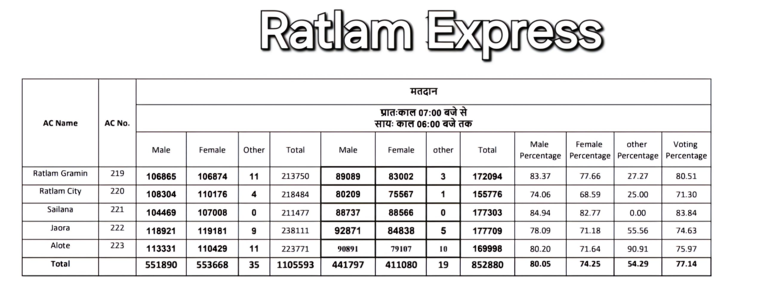 जिले के विधानसभा निर्वाचन क्षेत्र रतलाम शहर में 71.30 प्रतिशत, रतलाम ग्रामीण में 80.51 प्रतिशत, सैलाना में 83.84 प्रतिशत, जावरा में 74.63 प्रतिशत तथा विधानसभा निर्वाचन क्षेत्र आलोट में 75.97 प्रतिशत मतदान की खबर है।