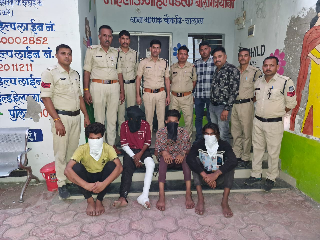 श्रीमान पुलिस अधीक्षक महोदय रतलाम श्री राहुल कुमार लोढा (भा.पु.से.) के कुशल निर्देशन मे एवं अति.पुलिस अधीक्षक महोदय रतलाम श्री राकेश खाखा व नगर पुलिस अधीक्षक रतलाम श्री अभिनव बारंगे के मार्गदर्शन मे थाना माणकचौक रतलाम के थाना प्रभारी निरीक्षक रणजीत सिंगार के नेतृत्व में फरार आरोपीयो की धरपकड़ हेतु टीम गठित की गयी। गठित टीम द्वारा आरोपीगणो की धरपकड़ के लगातार प्रयास किया जाकर आज दिनाँक 31.05.24 को गठीत टीम द्वारा मुखबीर सुचना पर गाँव ईसरथुनी झरने के पास जंगल से सभी आरोपीगण – 1.विकास उर्फ विक्या पिता मंगल गोयर निवासी हरिजन बस्ती सिलावटो का वास रतलाम, 2.आशु उर्फ अरव पिता आनन्द चावरे निवासी कुलकर्णी का भट्टा परदेसीपुरा इन्दौर हा.मु. रतलाम, 3.आदित्य पिता संजय मेहरोलिया निवासी हरिजन बस्ती सिलावटो का वास रतलाम, 4.अनिकेत उर्फ तोतू पिता मंगल गोयर निवासी हरिजन बस्ती सिलावटो का वास रतलाम 5. एक विधि विरुद्ध बालक को दबीश देकर गिरफ्तार किया। आरोपीगण से घटना के सम्बंध मे पुछताछ की जा रही है ।