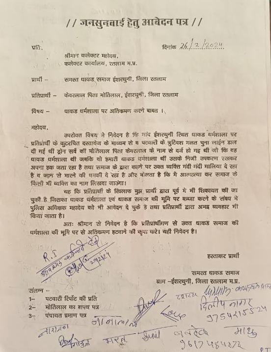 मौके पर पुलिस अधिकारी , राजस्व अधिकारी व गांव के लोग भी उपस्थित थे। थोड़ी देर बाद अनावेदक चन्द्रप्रकाश उर्फ चन्दु द्वारा अपने घर से तलवार लाकर लहराई जा रही थी। थाना क्षेत्र में विवाद से संबंधित एक वीडियो भी वायरल हुआ था। जिस पर फरियादी दिलीप नागर पिता जगन्नाथ नागर जाति धाकड उम्र 30 साल निवासी थाना औद्योगिक क्षैत्र रतलाम की रिपोर्ट पर से अपराध क्रमांक 165/2024 धारा 294,323,506,34 भादवि का पंजीबद्ध कर विवेचना में लिया गया था।