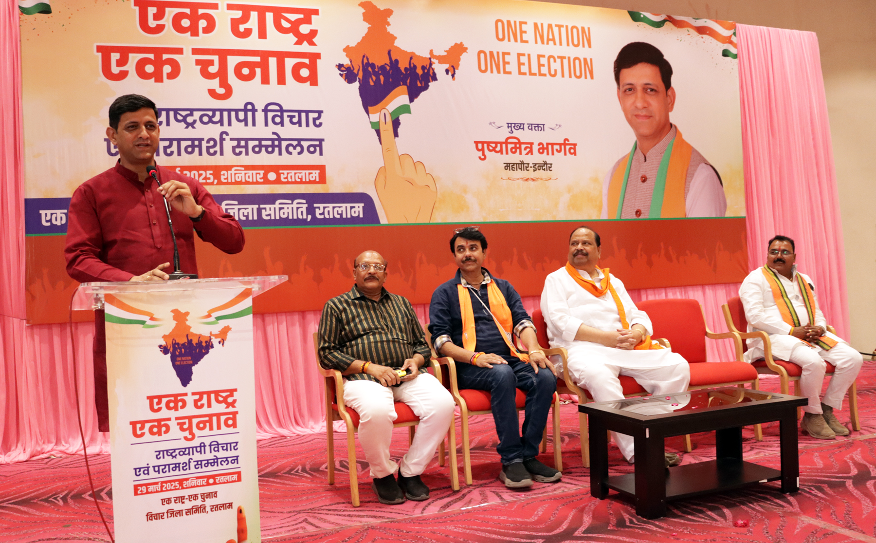 रतलाम 30 मार्च 2025। एक राष्ट्र-एक चुनाव, विचार जिला समिति के तत्वावधान में एक राष्ट्र-एक चुनाव राष्ट्रव्यापी विचार परामर्श सम्मेलन का आयोजन जोधा बाग में हुआ। इसे मुख्य वक्ता के रूप में वन नेशन, वन इलेक्शन विचार समिति के प्रदेश सहसंयोजक इंदौर महापौर पुष्यमित्र भार्गव ने संबोधित किया। इस अवसर पर कैबिनेट मंत्री चेतन्य काश्यप, भाजपा जिला अध्यक्ष प्रदीप उपाध्याय, महापौर प्रहलाद पटेल, जिला महामंत्री एवं संयोजक निर्मल कटारिया मंचासीन रहे।