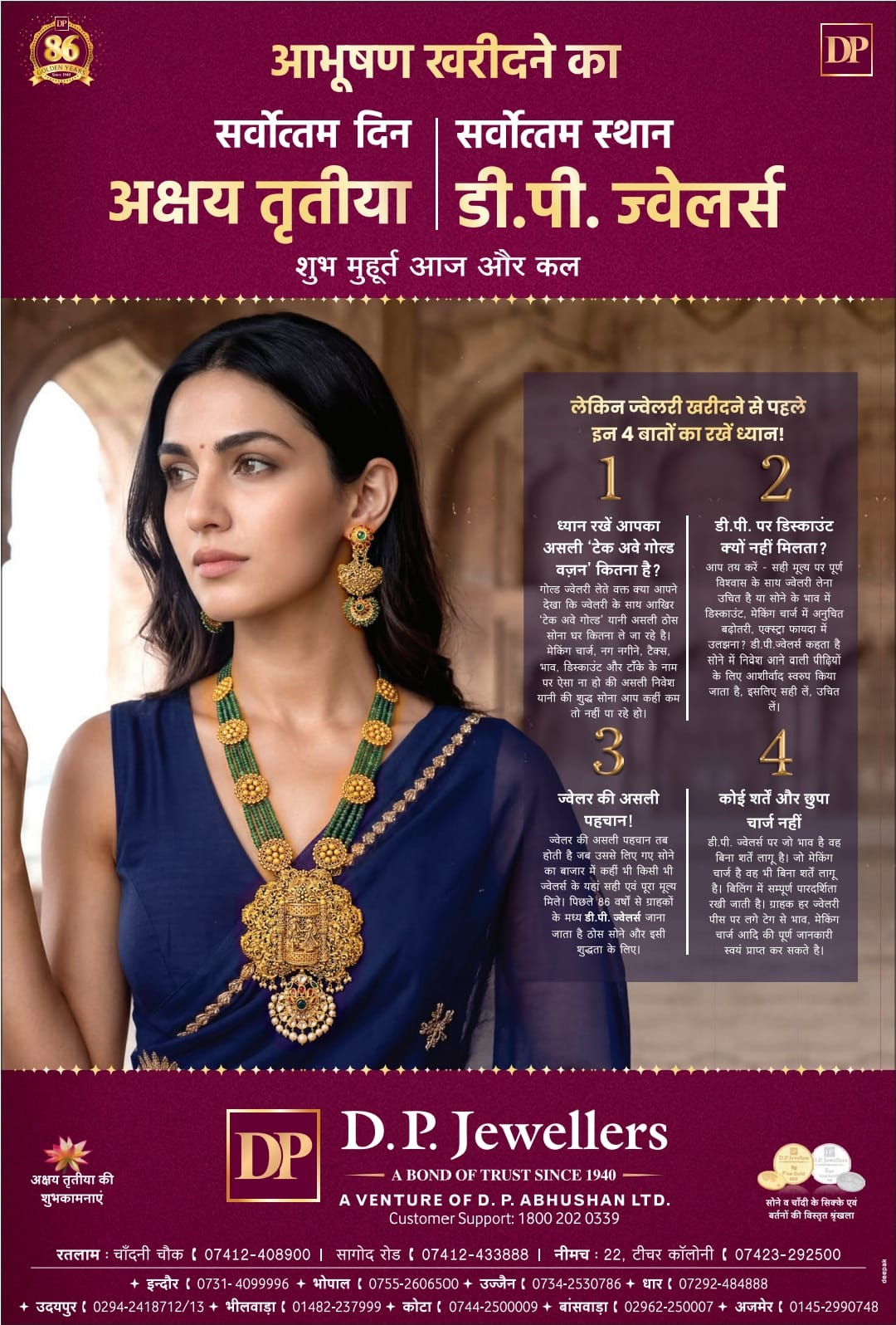 मान्यता है कि अक्षय तृतीया पर खरीदा गया सोना सुख-समृद्धि लाता है। इसी भाव का सम्मान करते हुए डी.पी. ज्वेलर्स अपनी शुद्धता की विरासत के साथ ग्राहकों के स्वागत के लिए तत्पर है। खरीदारी के लिए रतलाम सहित डी.पी. ज्वेलर्स के सभी शोरूम्स पर विशेष प्रबंध किए गए हैं ताकि ग्राहकों को एक यादगार शॉपिंग अनुभव मिल सके।